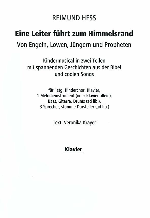 Kindermusical in zwei Teilen mit spannenden Geschichten aus der Bibel und coolen Songs für 1stg. Kinderchor, Klavier, 1 Melodieinstrument (oder Klavier allein), Bass, Gitarre, Drums (ad lib.), 3 Sprecher, stumme Darsteller (ad lib.) Text: Veronika Krayer