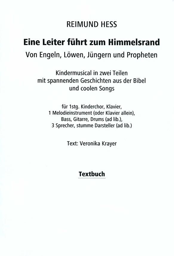 Kindermusical in zwei Teilen mit spannenden Geschichten aus der Bibel und coolen Songs für 1stg. Kinderchor, Klavier, 1 Melodieinstrument (oder Klavier allein), Bass, Gitarre, Drums (ad lib.), 3 Sprecher, stumme Darsteller (ad lib.) Text: Veronika Krayer