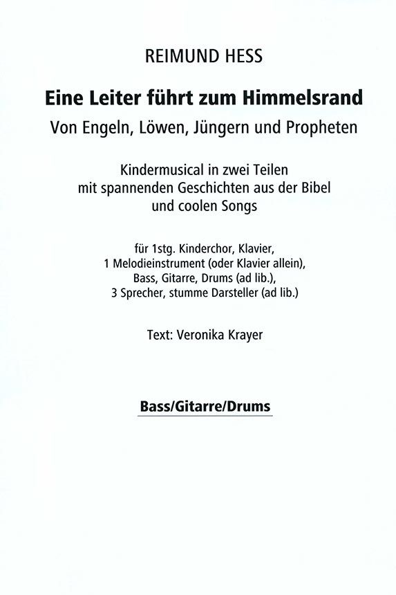 Kindermusical in zwei Teilen mit spannenden Geschichten aus der Bibel und coolen Songs für 1stg. Kinderchor, Klavier, 1 Melodieinstrument (oder Klavier allein), Bass, Gitarre, Drums (ad lib.), 3 Sprecher, stumme Darsteller (ad lib.) Text: Veronika Krayer