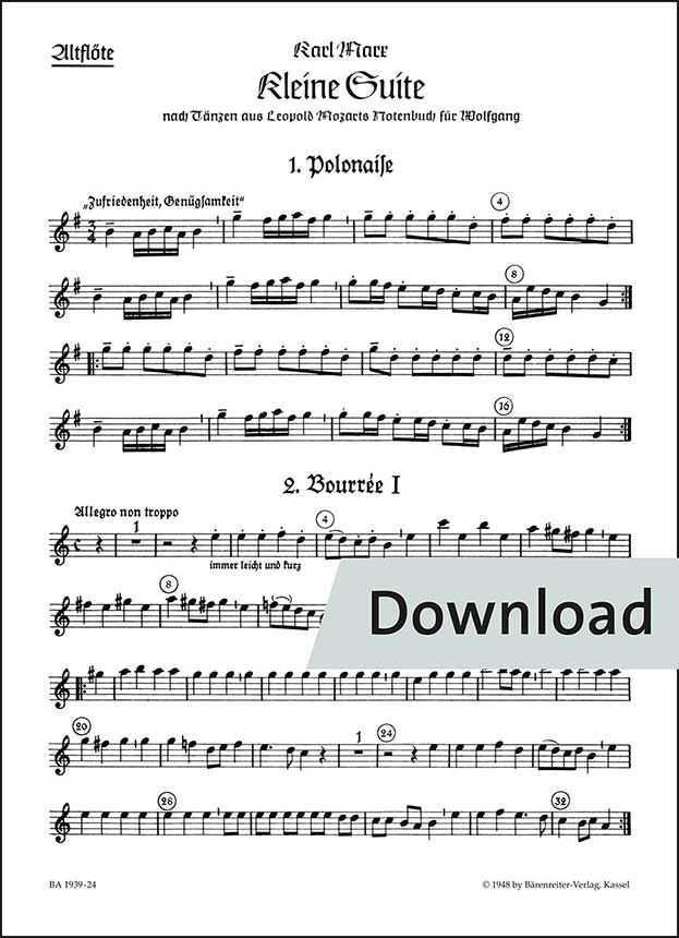 5 Sätze für Blockflötenquartett oder Streichinstrumente. Polonaise, Bourrée I, Air en Menuet, Bourrée II, Schwabentanz. Sopran-Blockflöte in c, Alt-Blockflöte in f,g, Tenor-Blockflöte in c,d, Bass-Blockflöte in f
