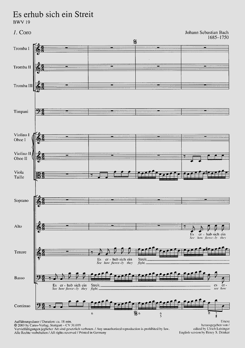 - Besetzung Gemischter Chor (SATB), Soli, 3 Trompeten, Pauke, 2 Oboen, 2 Violinen, 2 Violen und Basso Continuo