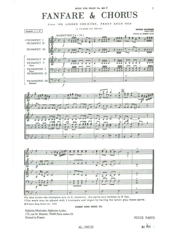 SATBB chorus, 4 trumpets, trumpet 5 (or horn), trombone (or horn) and 2 trombones.