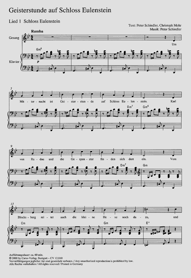Ein spannendes Grusical - Auf geht's nach Schloss Eulenstein, wo alle großen und kleinen Geister sehnsüchtig darauf warten, wieder einmal spuken zu dürfen. Wie kommt man dahin? Man braucht singende und tanzende Geister mit Schauspieltalent für die 1-2stg Lieder. Die Lieder werden von einem Klavier begleitet, wenn möglich noch von einem Bass und einem Schlagzeug. Dann wird ein Bühnenbild gebaut, werden Requisiten gebastelt und Schummerlicht eingeschaltet. Vor allem braucht man eine Krachmaschine. Ein Vorschlag, wie eine solche Krachmaschine aussehen könnte, findet sich in der Ausgabe. Natürlich helfen ausgefallene Kostüme, die Zuschauer das Gruseln zu lehren. Huuuuh! Der Geisterfantasie sind dabei keine Grenzen gesetzt. Huhu? Huhu! Kinderchor, Begleitband, darstellende Solisten.