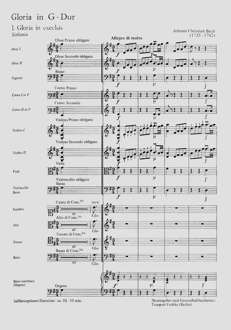 Während sich in früheren Messkompositionen die Soli in den Bau des Gesamtsatzes eingliederten, wird bei Christian Bach die solistische Partie im Sinne der Neapolitanischen Schule verselbständigt. Das Orchester beteiligt sich mit längeren Vorspielen und rauschendem Figurenwerk. In den elf Sätzen des Werkes gelingt es Bach, Kompositionstechnik und Ausdruckskraft des Barock mit dem Wohlklang einer italienischen Kantilene zu vereinen. Aus dem Vorwort von Traugott Fedtke. Soli SATB, Coro SATB, 2 Fl, 2 Ob, 1 Fg, 2 Cor, 3 Vl, 2 Va, Vc, Bc