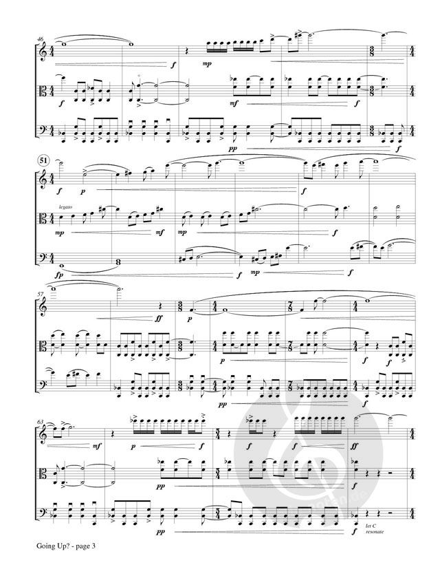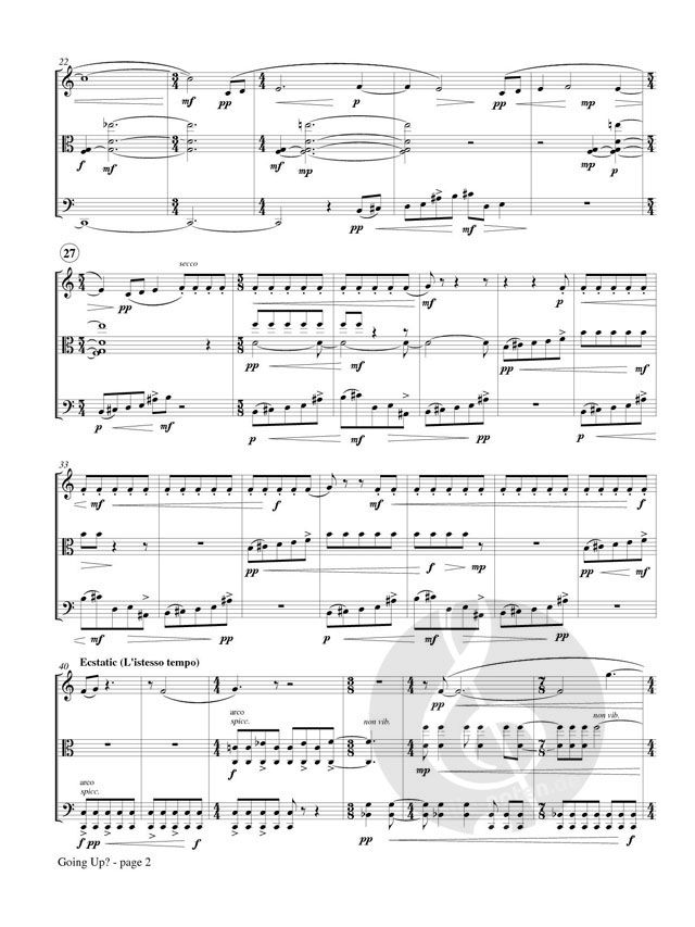 Going Up?' was commissioned in 2007 by the New York trio Eight Strings and a Whistle and completed in 2008. The material and energy of the piece continually pulls the listener upward, hence the title. There are three themes, all ascending, introduced in the first moments respectively by the flute as the piece opens, the pizzicato cello in measure 4, and the pizzicato cello again in measure 8.