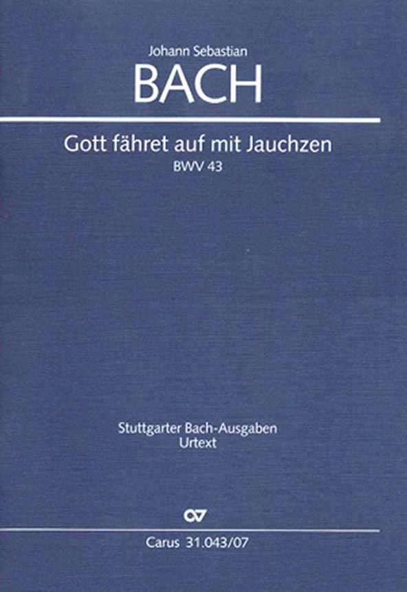 Kantate zum Himmelfahrtsfest - Als Teil seines dritten Leipziger Kantatenjahrgangs führte Bach am 30. Mai 1726 die Himmelfahrtskantate 'Gott fähret auf mit Jauchzen' auf. Ihr Text ist im gleichen Jahrin der in Rudolstadt ohne Angabe eines Textdichters erschienenen Sammlung 'Sonn- und Fest-Tags-Andachten über die ordentlichen Evangelia' enthalten. Diese Texte lagen bereits im Kirchenjahr 1704/05 am Meininger Hof vor, ihr Autor war möglicherweise Herzog Ernst Ludwig von Sachsen-Meiningen. Soli SATB, Coro SATB, 2 Ob, 3 Tr, Timp, 2 Vl, Va, Bc - Tonart C-Dur / G-Dur