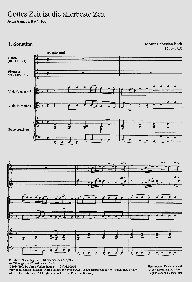 Actus tragicus. Trauermusik (Fassung in F) - Kompositionsanlass unbekannt (evtl. zum Tod von Bachs Onkel Tobias Lämmerhirt am 10.8.1707). Soli SATB, Coro SATB, 2 Blfl f1, 2 Vga, Org