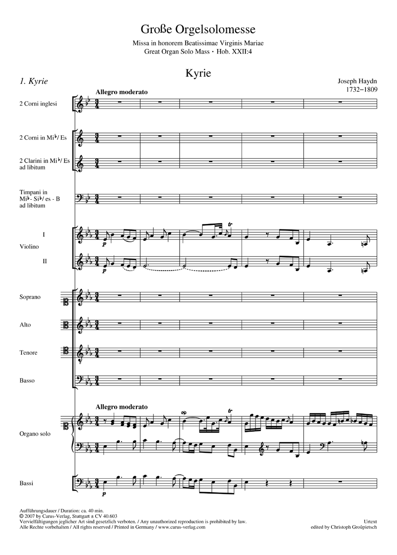 Missa in honorem Beatissimae Virginis Mariae - Haydns sogenannte Große Orgelsolomesse in Es-Dur zählt zu jenen Werken des Komponisten, die schon früh eine ausgesprochen weite Verbreitung fanden. Die in den Bläserpartien apart mit zwei Englischhörnern besetzte Messe ist um 1770 entstanden, in Haydns ersten Jahren als Kapellmeister der Fürsten Esterhßzy. Trotz des ädankbaren' Orgelparts, der über weite Strecken solistisch behandelt wird, erlebt die für ein Marienfest komponierte Missa in honorem Beatissimae Virginis Mariae heute nur selten eine Aufführung. Die Neuausgabe will dazu Impulse geben. - Soli SATB, Coro SATB, 2 Eh, 2 Cor, 2 Vl, Vc/Cb, Org solo, [2 Ctr, Timp]
