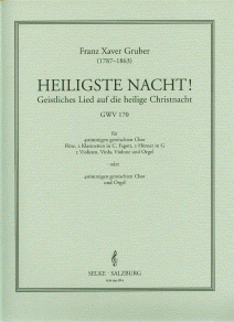 Geistliches Lied auf die heilige Christnacht für 4stg. gem. Chor, Flöte, 2 Klar., Fg., 2 Hr., Streicher und Orgel oder: 4stg. gem. Chor und Orgel. GWV 170. Herausgegeben von Thomas Hochradner. - Bevor das Lied 'Stille Nacht! Heilige Nacht!' seinen Siegeszug begann, nahm die vorliegende Fassung des Textes 'Heiligste Nacht!' dessen Platz ein. Das weitverbreitete Lied wurde von Franz Xaver Gruber (1787-1863) bearbeitet und er selbst setzte es 1836 als Nummer 1 der beiden aufgezeichneten Lieder noch vor die 'Stille Nacht!'. Für die Instrumentierung nutze er alle orchestralen Möglichkeiten, die ihm zur Verfügung standen. Die Instrumentierung lässt feinfühliges Gespür für Nuancen und, in Verbindung mit der dynamischen Gestaltung, zahlreiche differenzierende Schattierungen des Ausdrucks erkennen, ohne die melodische Geschlossenheit der Kantilene zu beeinträchtigen. Um die Ausführung auch mit vier Singstimmen und Orgel zu ermöglichen, wurde dieser Ausgabe ein Orgelauszug beigefügt.