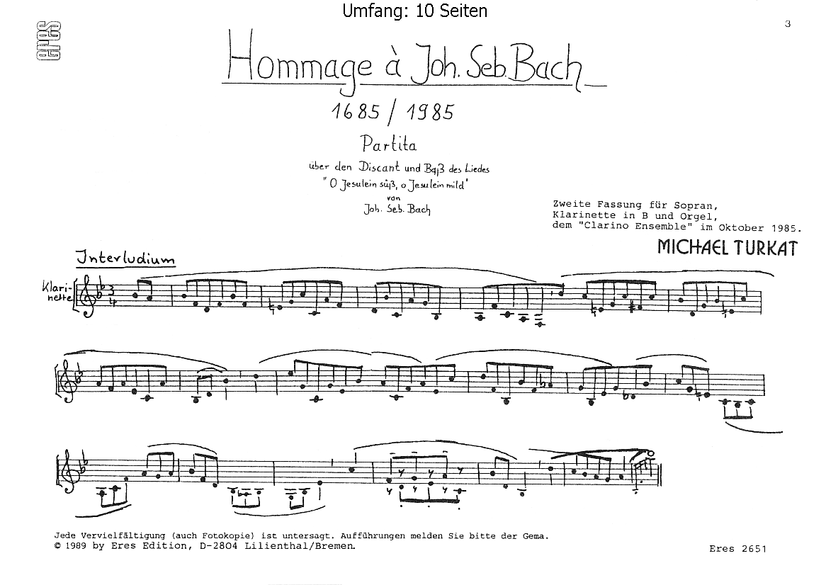 Partita über den Discant und Bass des Liedes 'O Jesulein süss, o Jesulein mild' für Sopran, Klarinette Bb und Orgel. Auff.-Dauer: 5'10.áá