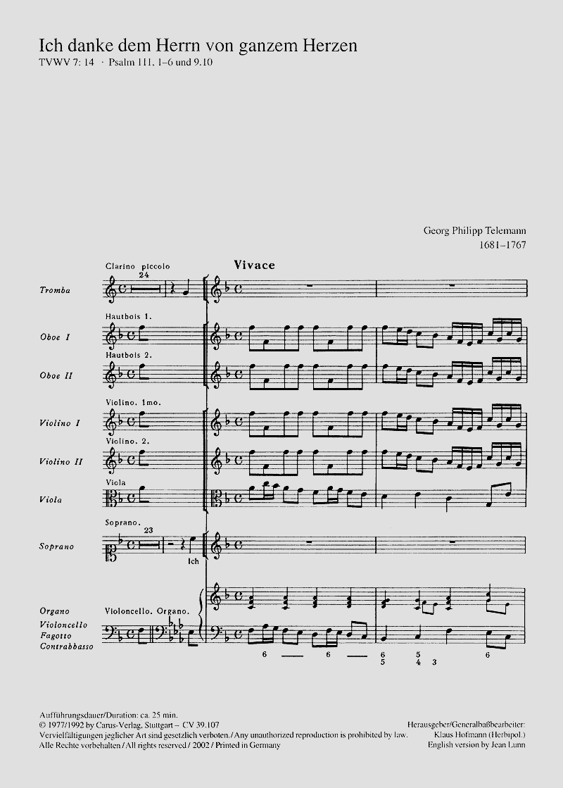 - Besetzung Soli, Gemischter Chor (SATB), Blockflöte, 2 Oboen, Trompete, 2 Violinen, Viola und Basso Continuo