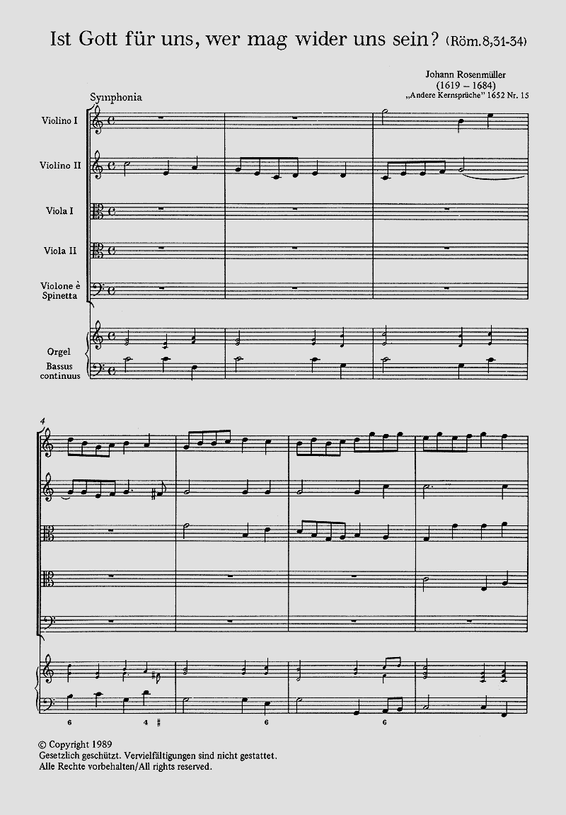 - Besetzung Gesang (hoch), 2 Violinen, 2 Violen, Violone und Basso Continuo