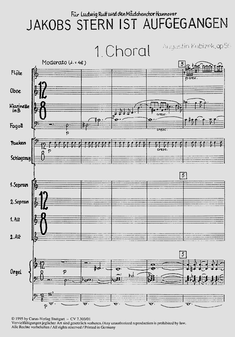 - Besetzung Soli, Frauenchor (SA), Querflöte, Oboe, Klarinette, Fagott, Pauke, Percussion und Orgel