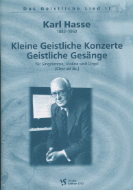Kleine geistliche Konzerte /Geistliche Gesänge für Singstimme, Violine, Chor ad lib. und Orgel. Hrsg. von Rolf Schönstedt. Part. incl. Vl.-Stimme. - Dieser zweite Band mit Musik aus dem Umfeld Max Regers (Band I: STRUBE1341) verdeutlicht das Schaffen seines Schülers Karl Hasse im Bereich der Kirchenmusik. Seine formale Weite wird dadurch verdeutlicht, dass der Paarung 'Singstimme und obligate Orgel' eine virtuose Solovioline und als Schlusschoral ein vierstimmiger Chor ad lib. hinzu tritt. Komplettiert wird die Trias von verdienstvollen Veröffentlichungen Rolf Schönfeldts zum 'Geistlichen Lied' mit dem Band 'Frauengestalten in der Bibel' (STRUBE1866).