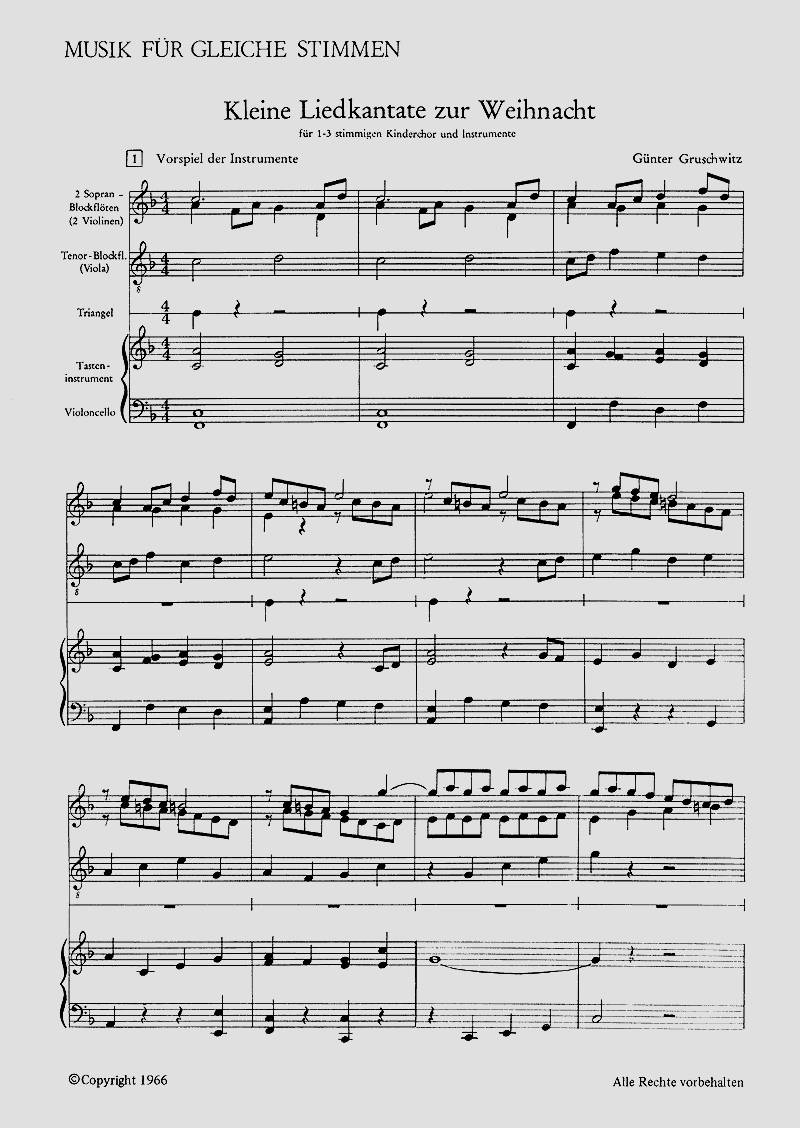 - Besetzung Kinderchor, Glockenspiel, Orff-Instrument, 2 Altblockflöten, Bassblockflöte, Cello und Klavier
