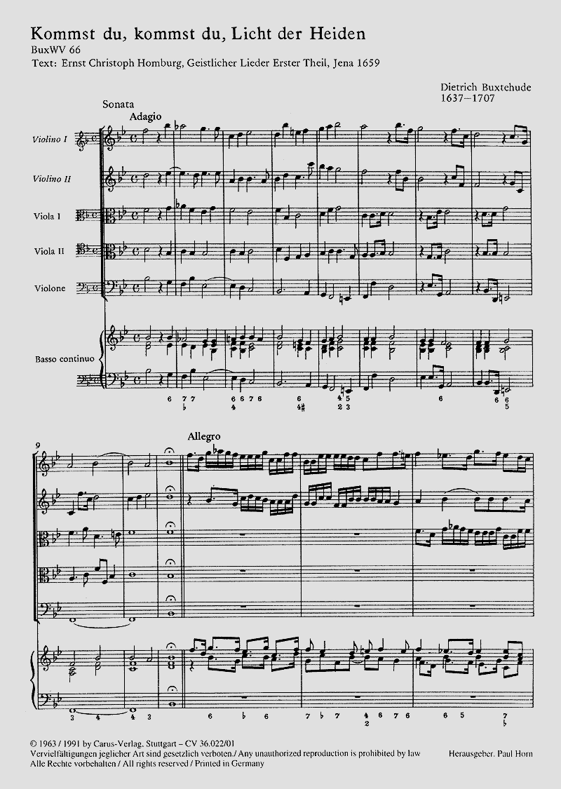 - Besetzung Gemischter Chor (SSB), 2 Violinen, 2 Violen, Kontrabass und Basso Continuo
