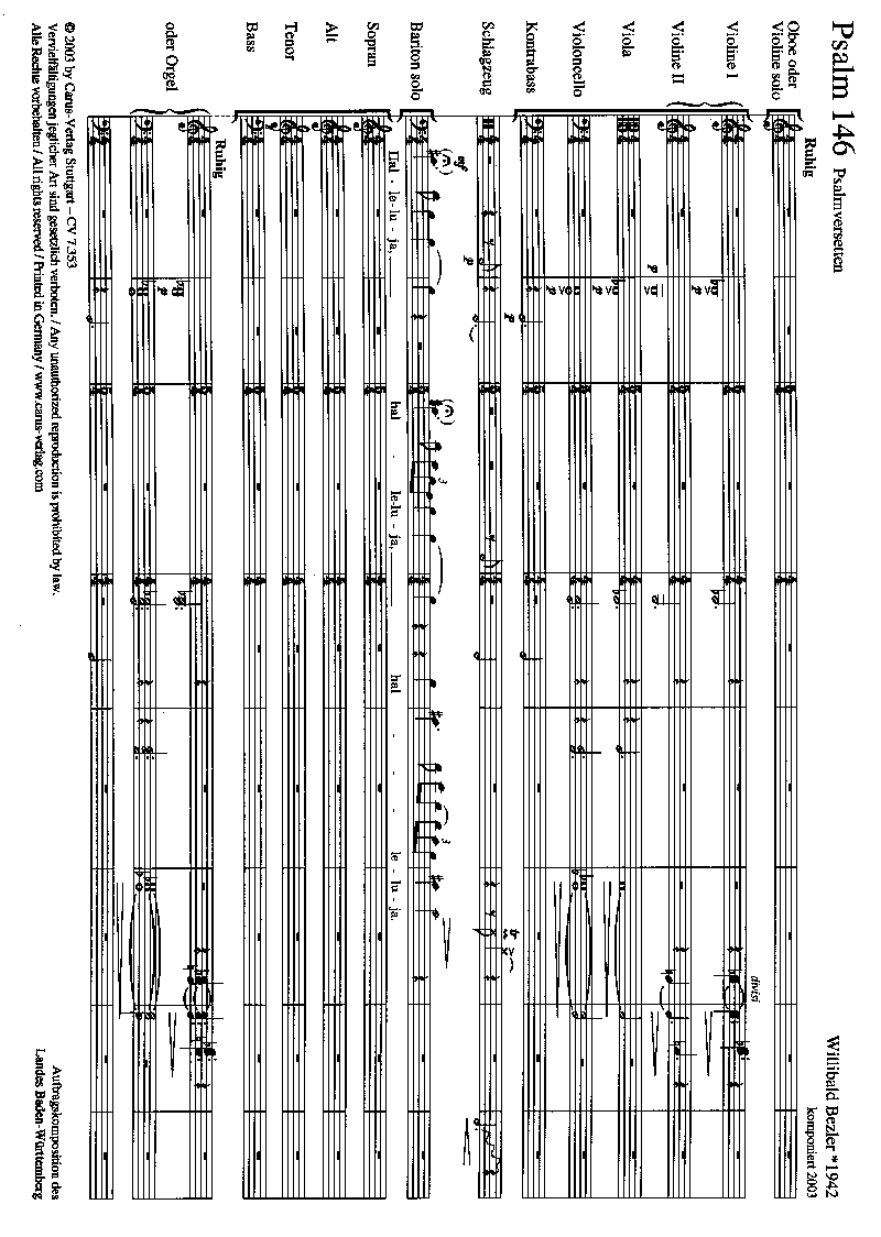 Psalm 146. Fassung 1: Solo Bar, Coro SATB, Ob (Vl solo), 2 Vl, Va, Vc, Cb, Perc; Fassung 2: Solo Bar, Coro SATB, Org, [Perc]