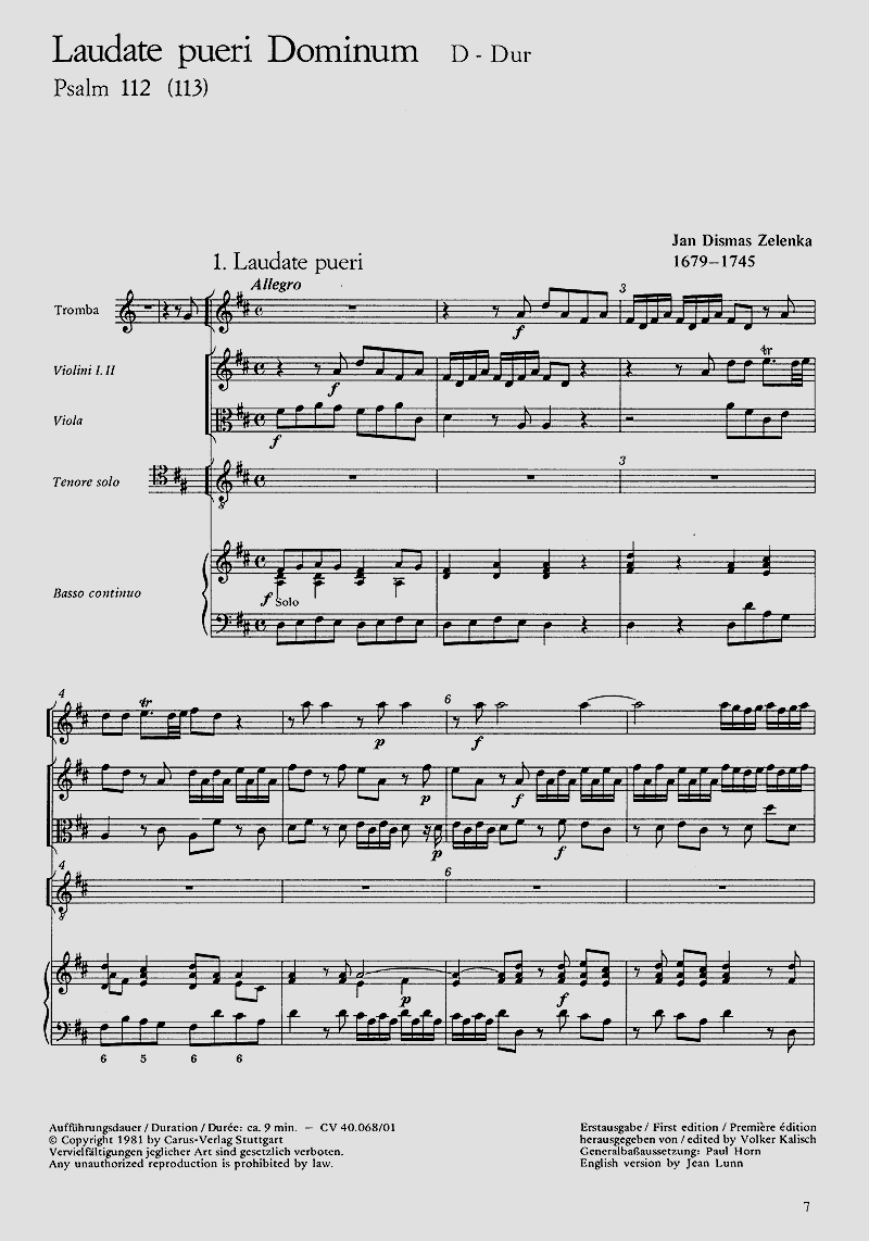 Neben den über zwanzig Messen Zelenkas, die zweifellos im Zentrum seines Schaffens stehen, sind wohl vor allem seine dreissig Psalmvertonungen von besonderer Bedeutung als in sich geschlossene, zum Teil mehrsätzige Zyklen. In ihnen spiegeln sich der ganze Reichtung und die Vielfalt von Zelenkas Kunst, ihn ihnen wender er alle Techniken und Satzweisen seiner Zeit an. - Solo T, Tr, 2 Vl, Va, Bc