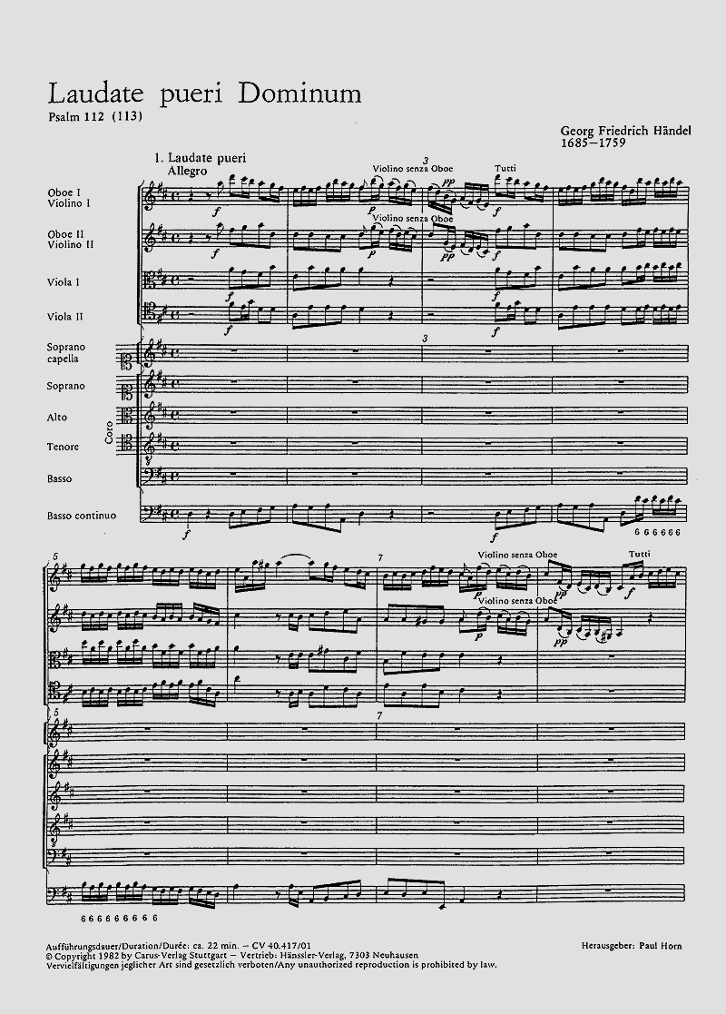 - Besetzung Gesang (hoch), Gemischter Chor (SSATB), 2 Oboen, 2 Violinen, 2 Violen und Basso Continuo