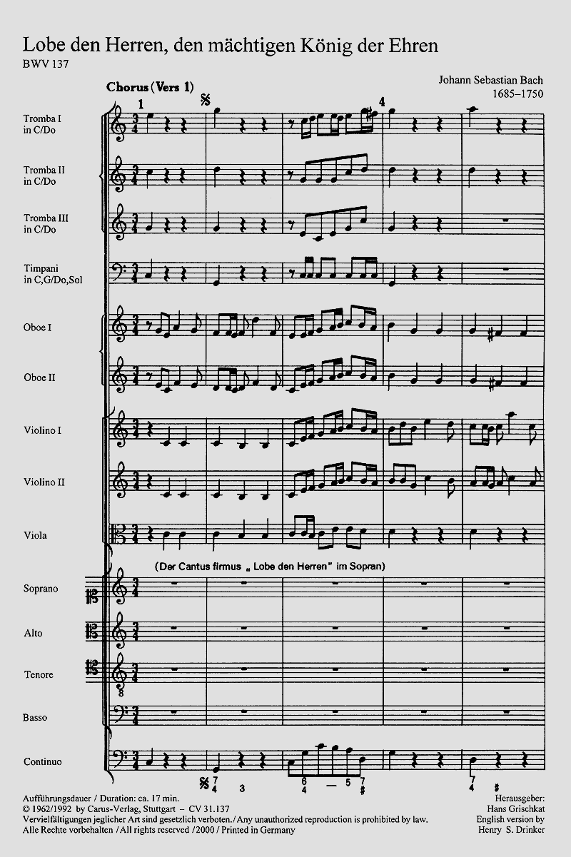 Kantate zum 12. Sonntag nach Trintitatis - Bach legte der Kantate 'Lobe den Herren, den mächtigen König' in allen Sätzen sowohl Melodie als auch Text des gleichnamigen Chorales zugrunde. Soli SATB, Coro SATB, 3 Tr, Timp, 2 Ob, Vl solo, Str, Org