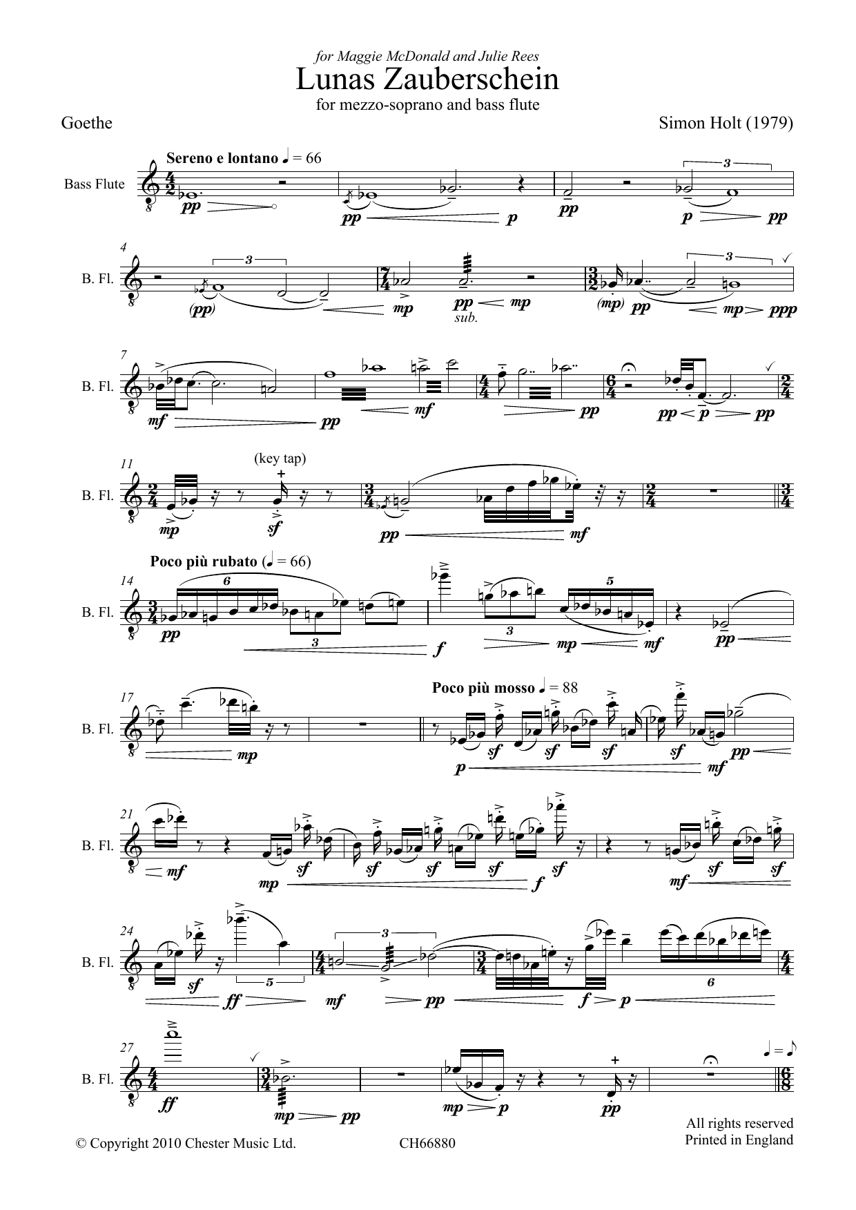 Lunas Zauberschein was first performed by Margaret McDonald (Mezzo-Soprano) and Julie Rees (Bass Flute) at the Royal Northern College of Music, Manchester, on 20th March 1979.