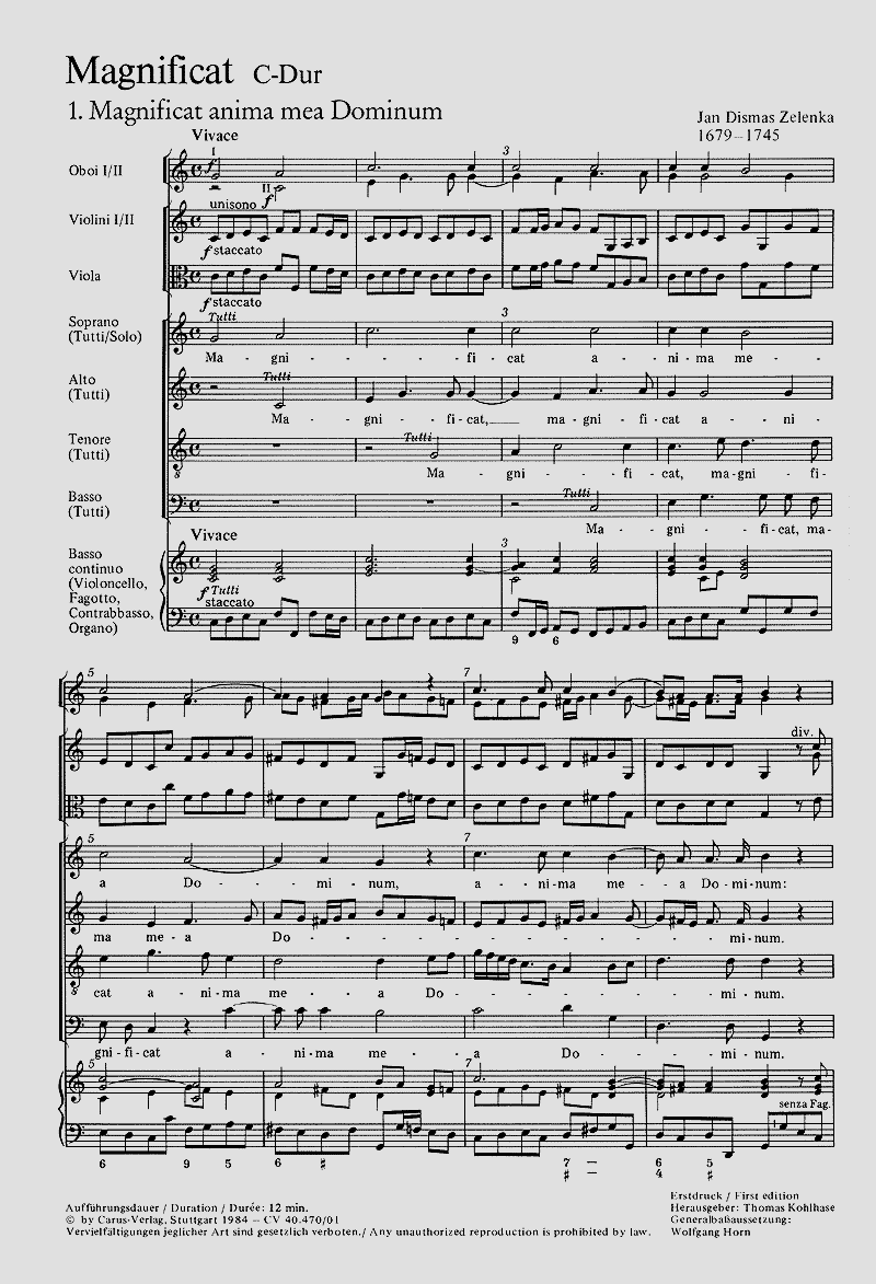 Das 'Magnificat in C' entstammt der Psalmensammlung, die Zelenka im Jahre 1735 zusammengestellt hat. Diese 'Psalmi varii', die auch Kompositionen anderer Komponisten umfassten, gehen offenbar zumeist auf Kompositionen zurück, die Zelenka schon Mitte der 1720er Jahre in der Dresdner Hofkirche aufgeführt hat. - Solo S, Coro SATB, 2 Ob, 2 Vl, Va, Bc