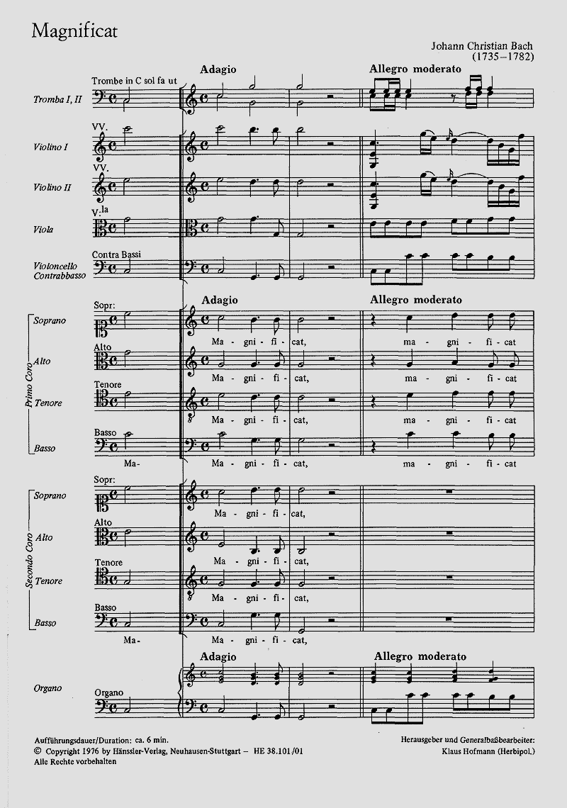 Das doppelchörige, mit Streichern und Trompeten besetzte Magnificat, das spätere der beiden vollständig erhaltenen Gattungsbeiträge Johann Christian Bachs, entstand 1758 in Mailand und diente für einen Festgottesdienst zu Ehren des heiligen Nepomuk. - Coro SATB/SATB, 2 Tr, 2 Vl, Va, Bc