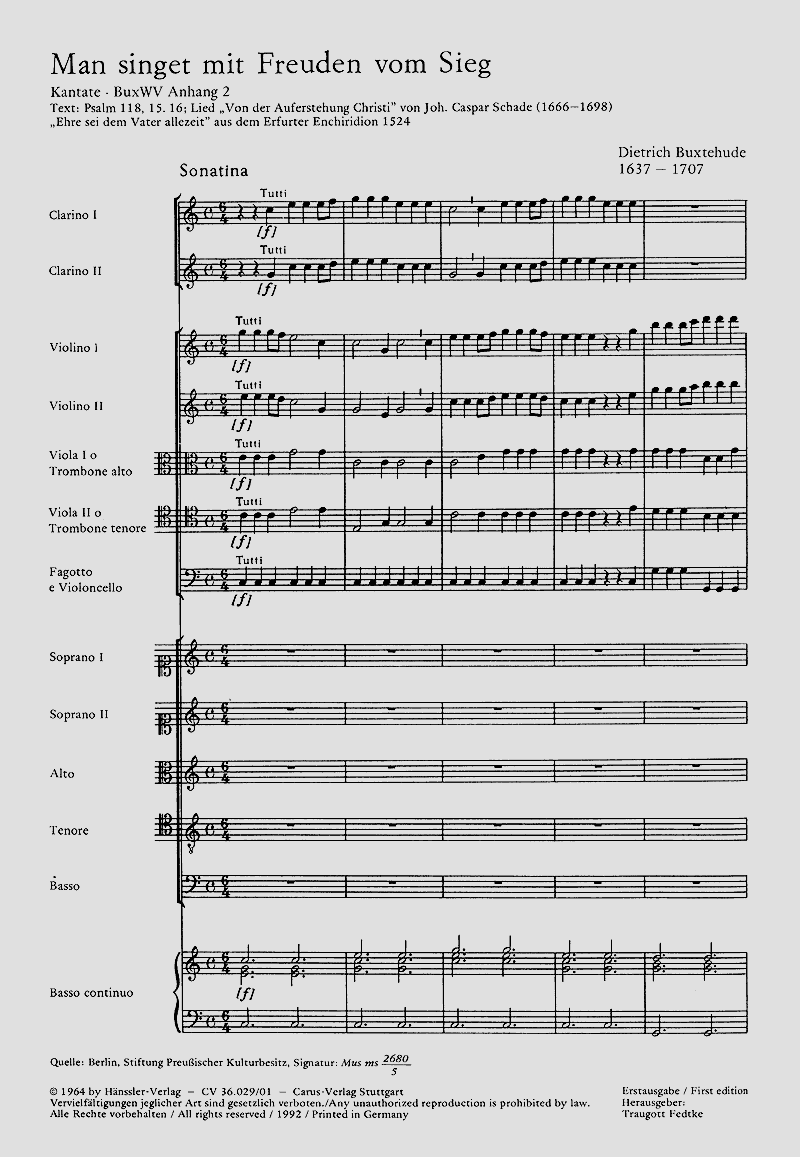 - Besetzung Gemischter Chor (SSATB), Fagott, Violone, 2 Trompeten, 2 Violinen, 2 Violen und Basso Continuo