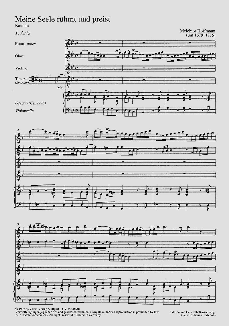 - Besetzung Gesang (hoch), Blockflöte, Oboe, Violine und Basso Continuo