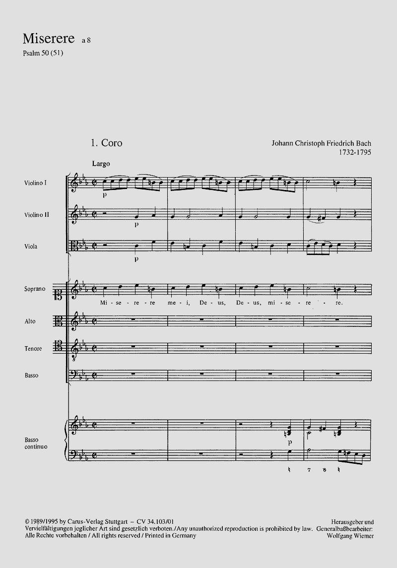 Nicht nur die Musiker des 16. und 17. Jahrhunderts haben - schon aus liturgischen Gründen - immer wieder Vertonungen des Busspsalms 50 (51) vorgelegt. Auch noch in späterer, säkularisierterer Zeit pflegten gelegentlich Komponisten diese Tradition, so der 'Bückeburger' Johann Christoph Friedrich Bach mit seiner 12-sätzigen Komposition von etwa 1770, die erst 1975 entdeckt wurde. Fast nur in B-Tonarten angesiedelt, besteht Bachs 'Miserere' aus einem ausgewogenen Wechsel von Chor- und Soloabschnitten. Gemeinsames Stilmerkmal aller Teile sind vor allem die reich verwendeten 'empfindsamen' Vorhaltsbildungen und kleinen Ziernoten. Als Beispiel des vorklassischen Zeitalters eignet sich die Komposition gut für epochenübergreifende Programme mit Fasten- und Busskompositionen. Soli SATB, Coro SATB, 2 Vl, Va, Bc