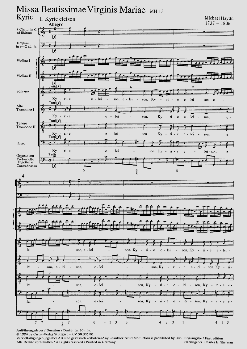 Die Missa Beatissimae Virginis Mariae entstand etwa 1758-1760, zwischen dem Ende von Haydns Zeit als Kapellsänger zu St. Stephan in Wien und seiner ersten Anstellung als Kapellmeister des Bischofs von Großwardein (im heutigen Rumänien). Zur Besetzung mit vierstimmigem Chor (chorisch wie solistisch) und dem 'Kirchentrio' treten noch zwei Trompeten (Clarini), Pauken sowie zwei Posaunen, welche die vokalen Alt- und Tenorstimmen im Tutti verstärken, im 'Et incarnatus est' aber auch obligat eingesetzt werden. Als Frühwerk steht die Messe einerseits in jener festlich-baro-cken Stiltradition, wie sie im süddeutschen Raum bis zur Jahrhundertmitte die Norm der kirchenmusikalischen Praxis darstellte; andererseits zeigt sie bereits subjektive Inspiration, wodurch sich das Werk von vielen Messvertonungen der Zeitgenossen abhebt. Soli SATB, Coro SATB, Fg, 2 Tr, 2 Trb, Timp, 2 Vl, Bc