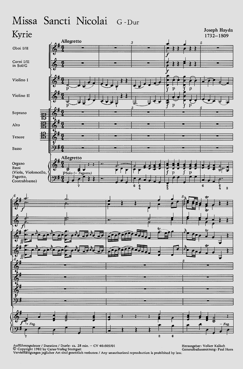 Nicolai-Messe - Mit den beiden letzten Missae breves, der äMissa Sti Nicolai' und der äMissa St Joannis de Deo', hat Haydn auch in dieser Gattung Meisterwerke geschaffen, die bereits zu seinen Lebzeiten zu den beliebtesten zählten - das zeigen ihre zahlreichen Abschriften. Soli SATB, Coro SATB, 2 Ob, 2 Cor, 2 Vl, Va, Vc/Cb, Org