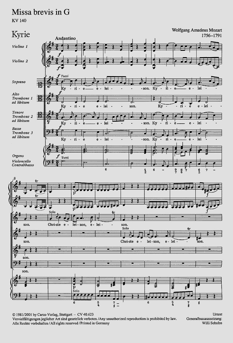 Mozart verfolgte in der G-Dur Messe den Typus der 'Missa pastoralis'. Dieser zu Zeiten Mozarts besonders in Böhmen und Italien verbreitete Messetyp bedient sihc gerne einer Melodie und Rhythmik, wie sie aus weihnachtlichen Pastorellen bekannst sind. Die Themen dieses Messetyps sind liedhaft und verwenden häufig Volkslieder oder lehen sich an bekannte Melodien an. Soli SATB, Coro SATB, 2 Vl, Vc/Cb, Org, [3 Trb]