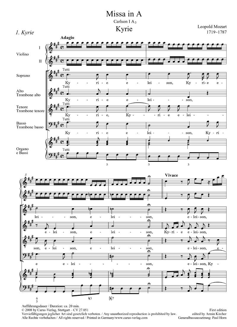 Wurde Leopold Mozart zu Lebzeiten vor allem als Komponist von programmatischer Instrumentalmusik geschätzt, hat sich doch seine Kirchenmusik als der gewichtigere Teil seines Werkes erwiesen. Dies gilt nicht zuletzt auch für den Einfluss, den diese auf die geistlichen Kompositionen seines Sohnes Wolfgang Amadeus ausübte. In der um 1765 komponierten Missa in A verschmilzt Leopold Mozart in zeitüblicher Weise barocke und galante Stilemente und verleiht dem Credo durch formale Gestaltung und eine expressiven Tonsprache ein besonderes Gewicht. - Soli SATB, Coro SATB, 2 Vl, Bc, [3 Trb]
