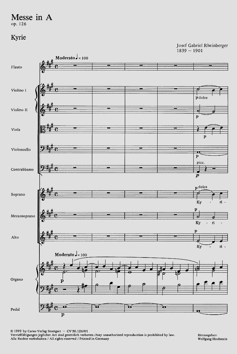 in nativitate Domini - Rheinbergers A-Dur-Messe ist ein leicht auszuführendes Werk. Sie verzichtet auf polyphone Entwicklungen und verbleibt in einem durch kurze Imitationsphasen leicht aufgelockerten harmonischen Satz. Die Orgelbegleitung dient als klangliche Stütze und erweitert den dreistimmigen Satz zur Vierstimmigkeit. Orchesterfassung: Coro SSA, Fl, 2 Vl, Va, Vc/Cb, Org; Orgelfassung: Coro SSA, Org