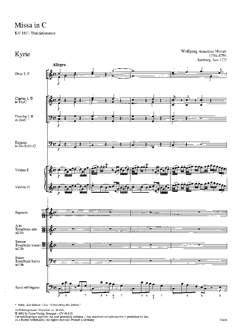 Trinitatismesse - Aufgrund der Forderung des Erzbischofs in Salzburg, dass selbst eine feierliche Messe nicht länger als eine Dreiviertelstunde dauern darf, komponierte Mozart eine dem kirchlichen Hochfest der Dreifaltigkeit angemessene 'Missa brevis et solemnis', d. h. eine feierliche, mit vier Trompeten besetzte, aber relativ kurz gehaltene Messe. Als einzige Messe Mozarts verzichtet sie sogar auf den Sologesang. Diese wohl den Aufführungsbedingungen geschuldete Ökonomie der Besetzung führte zu einer nahezu rein sinfonischen Gestaltung der Messe. Coro SATB, 2 Ob, 2 Ctr, 2 Tr, Timp, 2 Vl, Bc, [3 Trb]