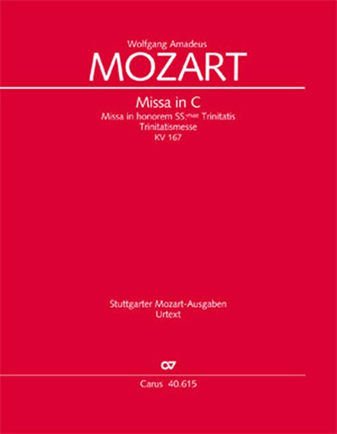 Trinitatismesse - Aufgrund der Forderung des Erzbischofs in Salzburg, dass selbst eine feierliche Messe nicht länger als eine Dreiviertelstunde dauern darf, komponierte Mozart eine dem kirchlichen Hochfest der Dreifaltigkeit angemessene 'Missa brevis et solemnis', d. h. eine feierliche, mit vier Trompeten besetzte, aber relativ kurz gehaltene Messe. Als einzige Messe Mozarts verzichtet sie sogar auf den Sologesang. Diese wohl den Aufführungsbedingungen geschuldete Ökonomie der Besetzung führte zu einer nahezu rein sinfonischen Gestaltung der Messe. Coro SATB, 2 Ob, 2 Ctr, 2 Tr, Timp, 2 Vl, Bc, [3 Trb]