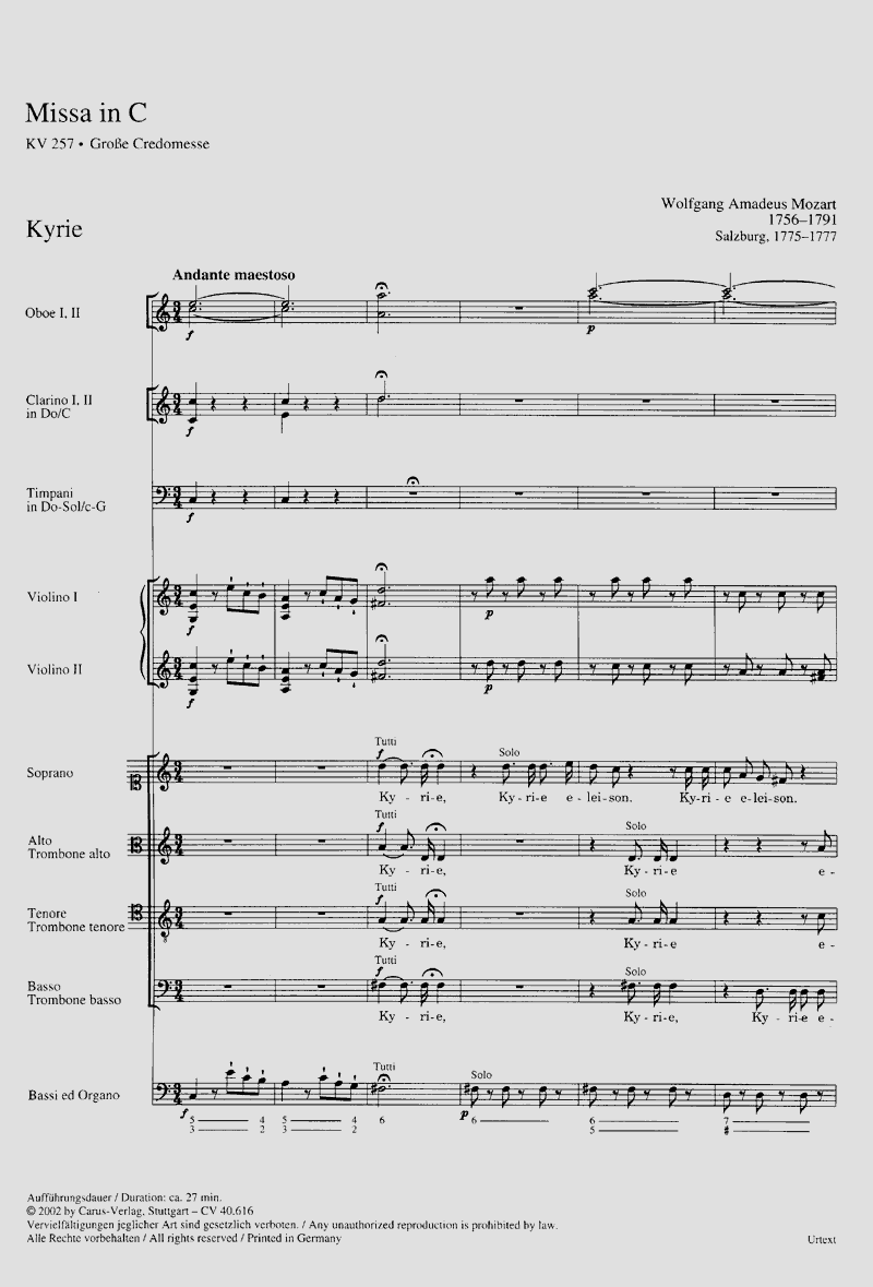 Große Credomesse - Mozart greift hier wie in seiner früheren 'Kleinen Credomesse' KV 192 eine kirchenmusikalische Praxis auf, die seit Beginn des 18. Jahrhunderts in Süddeutschland und Österreich nachgewiesen ist. Die mehrfache Wiederholung der Anfangsworte des 'Credo' setzte voraus, dass die Vertonung der Intonation 'Credo in unum Deum' liturgisch überhaupt toleriert wurde.Konnte man die sonst vom Zelebranten allein vorgetragene Intonation in die mehrstimmige Komposition einbeziehen, so war es nur ein kleiner und syntaktisch logischer Schritt, das 'Credo' vor den einzelnen Glaubensartikeln zu wiederholen und damit das Glaubenszeugnis zu bekräftigen. Soli SATB, Coro SATB, 2 Ob, 2 Ctr, 3 Trb, Timp, 2 Vl, Bc