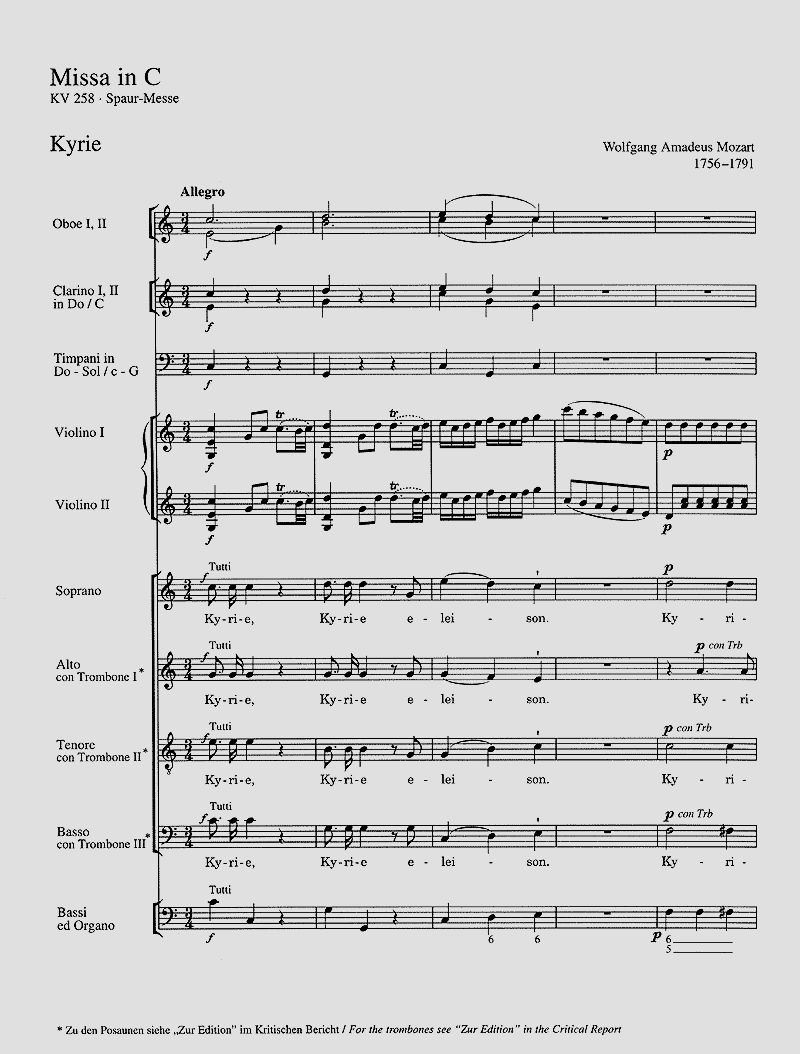 Spaur-Messe - Der relativ unspektakuläre Habitus der 'Spaur-Messe' mag einer der Gründe dafür sein, dass sie im Musikschrifttum normalerweise eher am Rande, als kleine Schwester der 'bedeutenden Kirchenwerke Mozarts behandelt wird. Der Besetzung nach gehört die Messe zum Typus der 'Missa solemnis', im Hinblick auf ihre zeitliche Ausdehnung und ihre stilistische Haltung aber ist sie weit eher als 'Missa brevis' zu bezeichnen. Soli SATB, Coro SATB, 2 Ctr, Timp, 2 Vl, Bc, [2 Ob, 3 Trb]