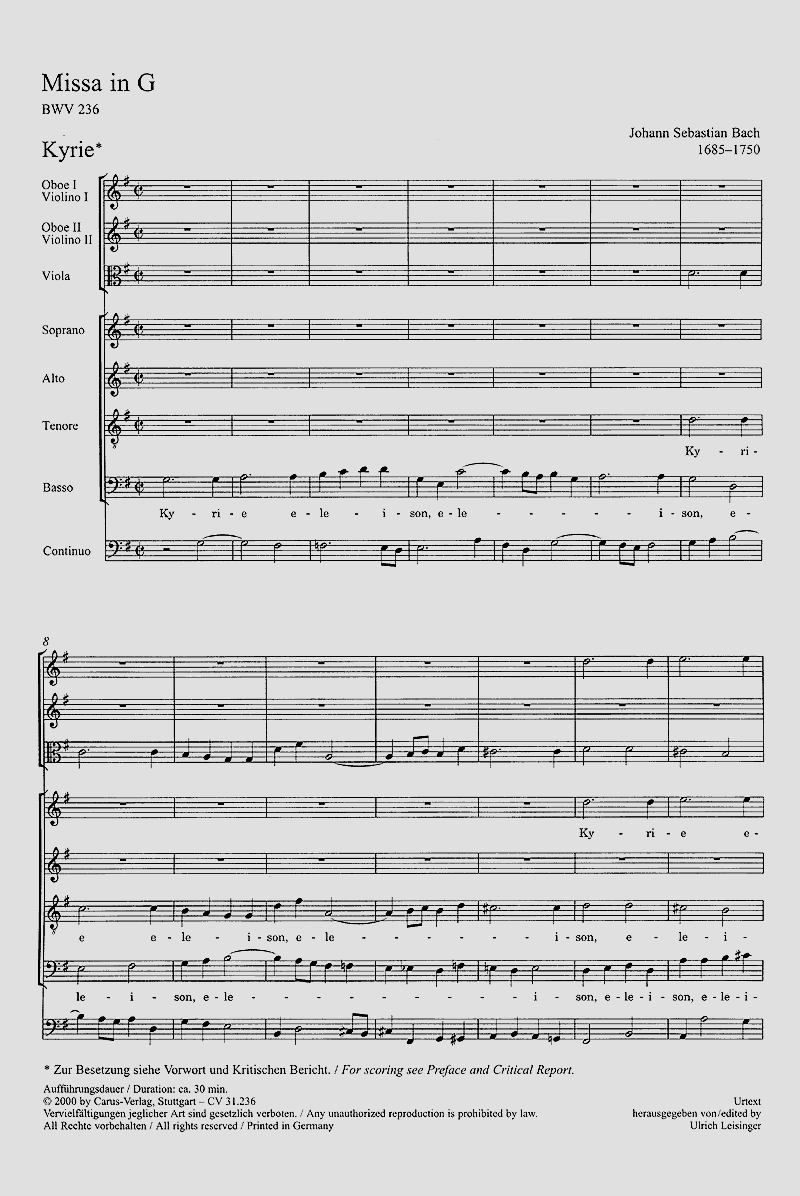 Neben der h-Moll-Messe existieren von Bach bekanntlich vier weitere, kleinere Messkompositionen, die sog. Lutherischen oder Kyrie-Gloria-Messen. Trotz ihrer hohen musikalischen Qualitäten, stehen sie oft im Schatten anderer Kirchenwerke Bachs. Mit ihrer jeweils sechssätzigen Anlage (bis 'Cum sancto spiritu') hatten sie ihre spezifische liturgische Stellung im Gottesdienst der Bach-Zeit. Die Messen bestehen zum grössten Teil aus Parodien, deren ursprüngliche Musik meist aus Kantaten stammt und die Bach nach bekannter Manier - dem neuen Werkkontext entsprechend - teilweise erheblich umgearbeitet hat. Ulrich Leisinger hat die vier Werke für Carus in neuen kritischen Ausgaben vorgelegt. Soli SATB, Coro SATB, 2 Ob, 2 Vl, Va, Bc