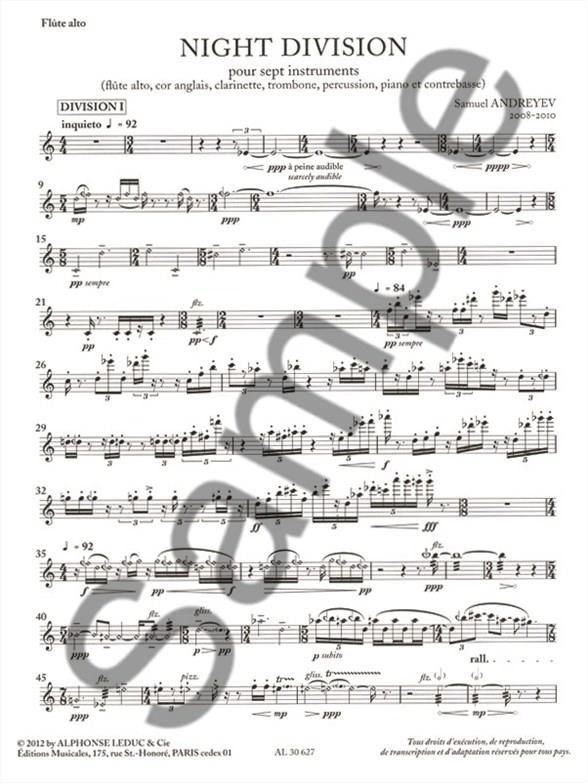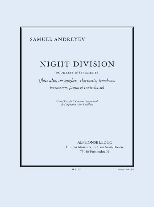 Night division pour 7 instruments (fl te alto, cor anglais, Clarinettete, trombone, percussion, piano et contrebasse) parties. Par Andreyev aux éditions Leduc. Partition / Livre de chansons pour Ensemble