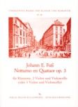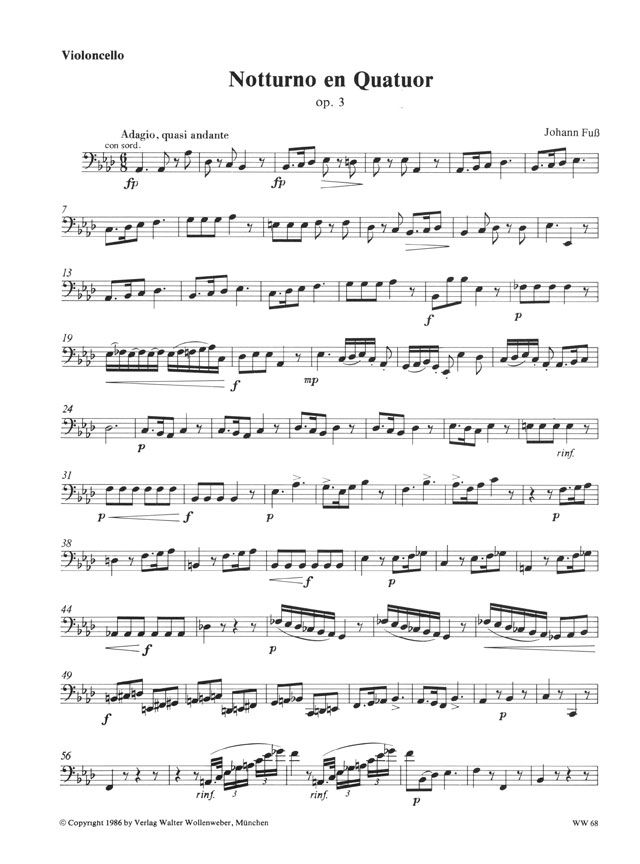 Johann Fuss wurde am 16.12.1777 in Tolna (Südungarn) geboren. In seiner Heimatregion erhielt er Musikunterricht und war anschliessend als Organist und Pianist tätig. 1801 ging er als Musiklehrer nach Pressburg, bald zog es ihn aber nach Wien, wo er Komposition bei Johann Georg Albrechtsberger studierte und freundschaftliche Bande zu Joseph Haydn knüpfte. In der Folgezeit hielt er sich abwechselnd in den beiden genannten Städten auf und erfreute sich bald überall eines geachteten Namens, selbst Beethoven schätzte seine Vokalwerke. Im Frühjahr 1817 suchte er in den Thermalbädern von Buda Heilung von seinen beschwerlichen Leiden und blieb dort bei seinem älteren Bruder bis zu seinem frühen Tode am 9.3.1819. Das Werkverzeichnis Fuss' umfasst vor allem Opern, Melodramen, Kirchenmusik, Chöre, Lieder und Klaviermusik sowie einige Violinwerke. Grösser besetzte Kammermusik schrieb er nur nach seinem ersten Wiener Aufenthalt. Dabei zeigte er eine Vorliebe für ungewöhnliche Besetzungen. Das 'Notturno en Quatuor op. 3' für 3 Bratschen und Violoncello (statt der 1. Bratsche kann auch eine Klarinette verwendet werden) komponierte er im September 1805 für seinen Pressburger Freund Heinrich Klein, als dieser Mitglied der Musikakademie Stockholm wurde. Es ist eine unpretentiöse Nachtmusik in gedeckten Farben, die mit einem pastoralen Adagio quasi Andante anhebt, dem ein Menuett und ein fugiert beginnendes, aber bald in homophone Kompaktheit übergehendes Andantino folgen. Ein gravitätischer Marsch beschliesst das hübsche Werk, das wegen seiner aparten Besetzung, sei es als reines Streicherensemble oder mit Klarinette, eine Neuausgabe wünschenswert erscheinen lässt. Dem Archiv der Gesellschaft der Musikfreunde Wien sei für die Zurverfügungstellung der ihr zugrunde liegenden Kopie des Erstdruckes und für die Publikationserlaubnis gedankt, Herrn Johann Czako, Nürnberg, für die Übersetzung biographischer Daten aus dem Ungarischen und für die Aufbereitung des Stimmenmaterials. Prof. Dr. W. Sawodny