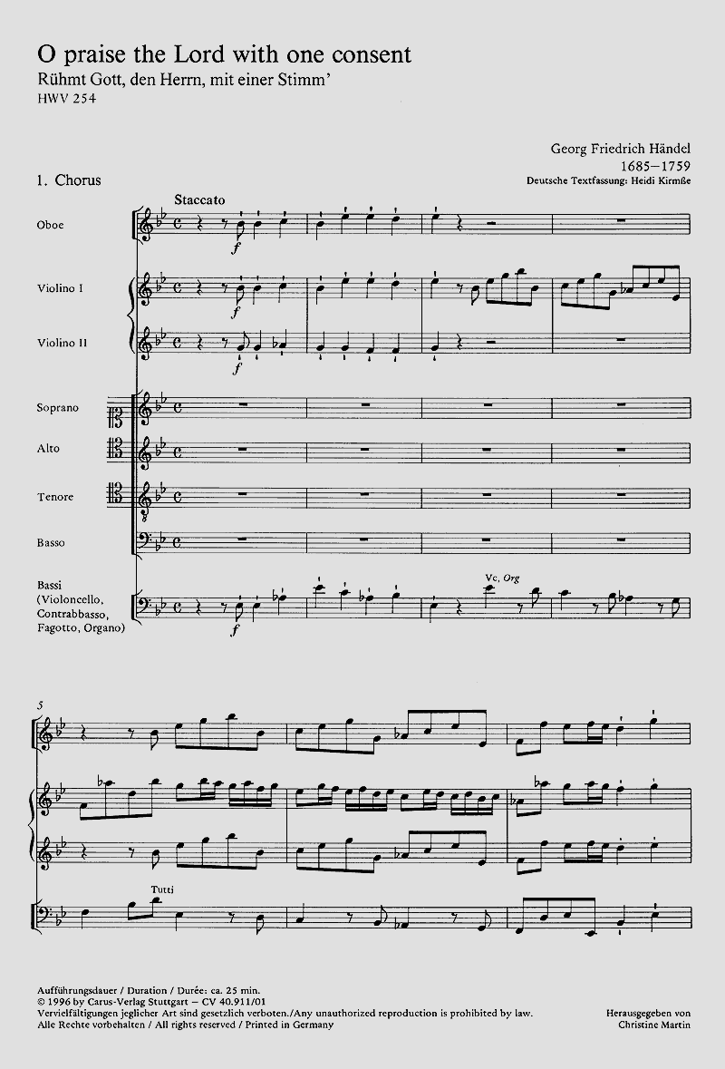 Anthem - Wie in vielen seiner Werke greift Händel auch in äO praise the Lord' auf frühere Kompositionen zurück. Die Arien des Anthems wirken, Verglichen mit Händels etwa zeitgleich komponierten italienischen Opernarien, trotz durchaus virtuoser Passagen eher schlicht und kurz. Solo ST(T)B, Coro SATB, Ob, 2 Vl, Bc