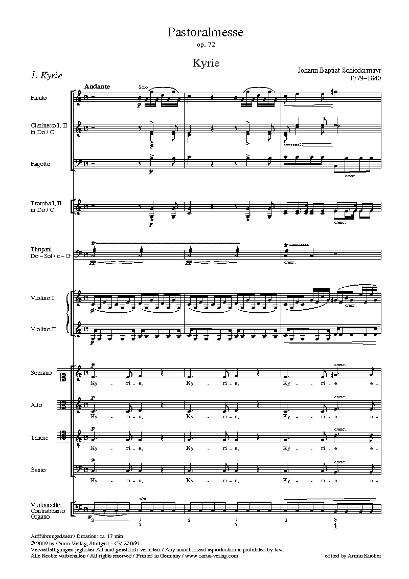 - Besetzung Soli, Gemischter Chor (SATB), Querflöte, 2 Klarinetten, 2 Trompeten, Pauke, 2 Violinen und Basso Continuo