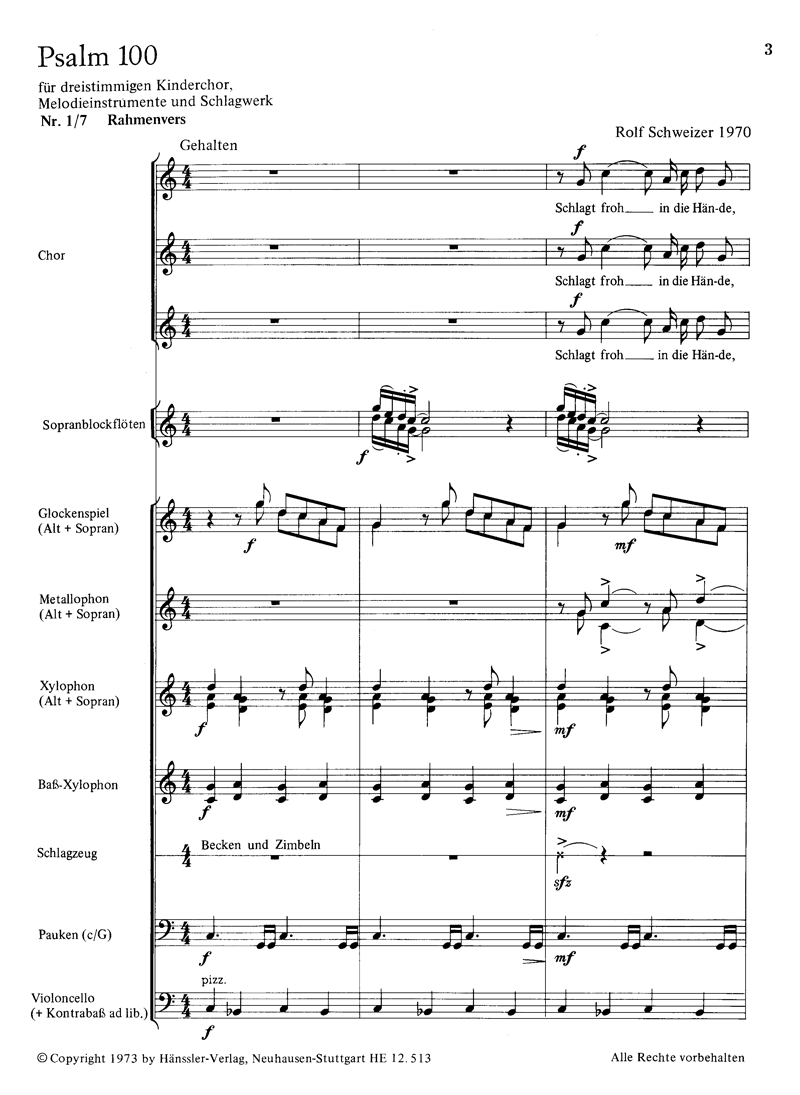 - Besetzung Kinderchor, Pauke, Orff-Instrument, Percussion, 2 Blockflöten und Cello