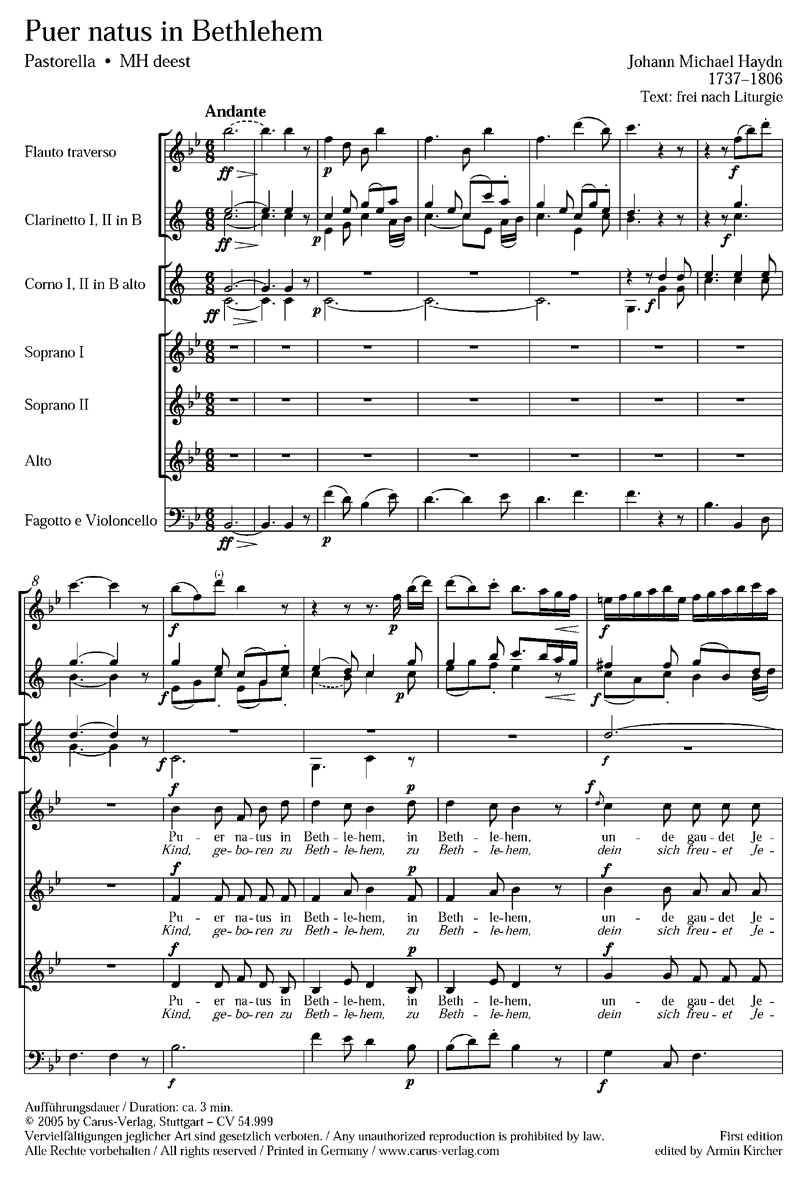 - Besetzung Frauenchor (SSA), Querflöte, 2 Klarinetten, Fagott, 2 Hörner und Basso Continuo