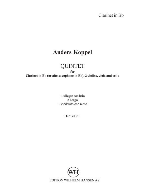 Set of parts for Anders Koppel's Quintet (Version B) for Clarinet in Bb (or Alto Saxophone in Eb) and String Quartet.