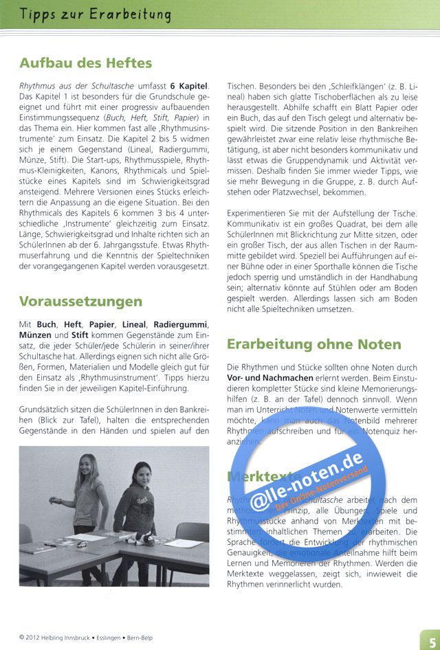 LehrerInnen und alle, die mit Kindern und Jugendlichen der 3. bis 7. Jahrgangsstufe rhythmisch arbeiten, entdecken hier eine wahre Fundgrube an frischen Percussion-Stücken. Anhand von zahlreichen Start-ups, Rhythmus-Kleinigkeiten, Kanons, Raps, Rhythmicals und Spielstücken wird die enorme Klangvielfalt der ,Instrumente' aus der Schultasche demonstriert:
