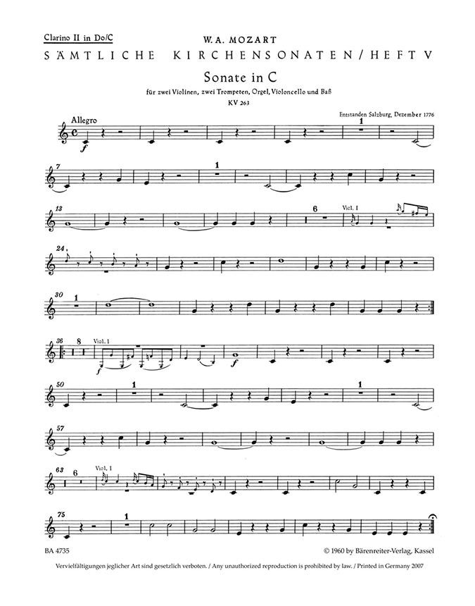 Sonate C-Dur KV 263 für zwei Violinen, zwei Trompeten, Orgel, Violoncello und Bass