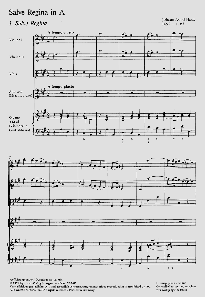Diese Vertonung der bekannten Marienantiphon wurde 1736 in Venedig geschrieben und war für eine der Sängerinnen am Ospedale degl'Incurabili bestimmt. Das Stück ist die einzige Kirchenkomposition Hasses, die schon zu seinen Lebzeiten im Druck herauskam (London 1740). - Solo A (Ms), 2 Vl, Va, Bc